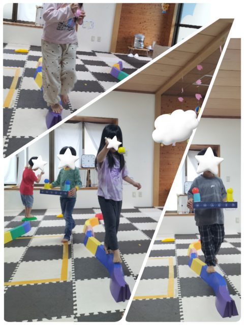 落とさないように一本橋を渡ります‼