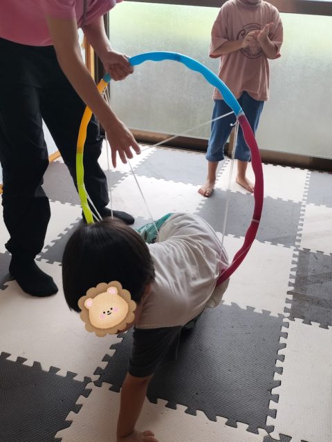 今日はフラフープで作ったクモの巣をくぐる遊びをしましたよ(*´▽`*)