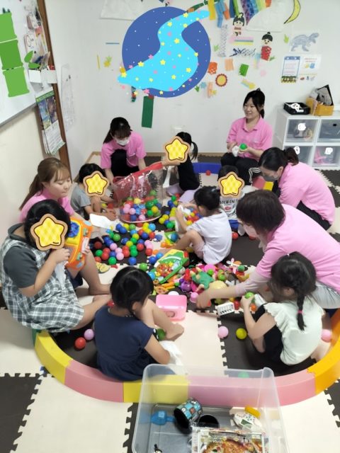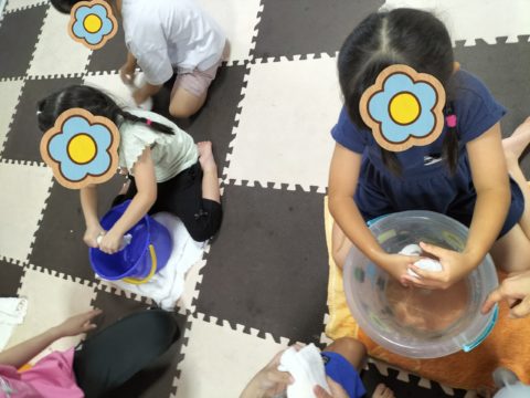 自分で絞った雑巾で、よく遊ぶカラーボールと