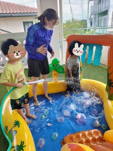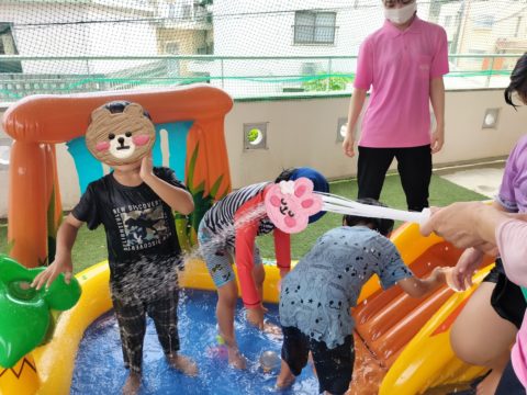 スタッフも子ども達もみんな大はしゃぎの水遊び💦