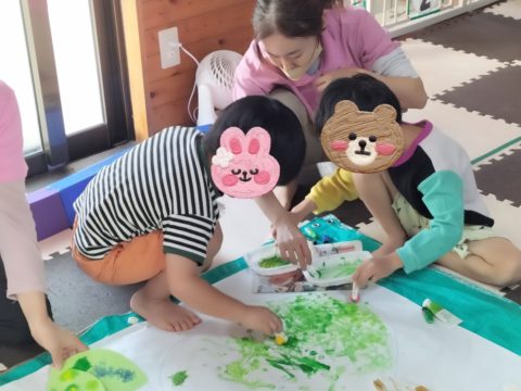 緑や黄緑の絵の具を、綿棒やフェルトボールを作ったスタンプでポンポン🎶