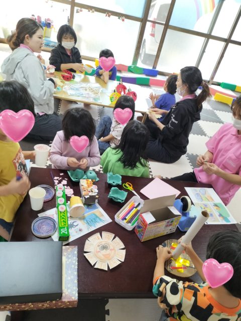 ペンやクレヨン、糊、ハサミを使う時はお友達やスタッフに