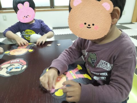 こちらのグループでは、アンパンマンやピカチュウ、マリオなどのキャラクターの福笑いをしています(^^♪