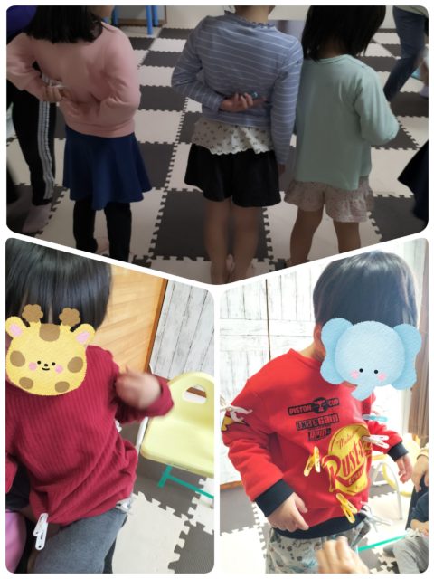 スタッフが子ども達に洗濯バサミを